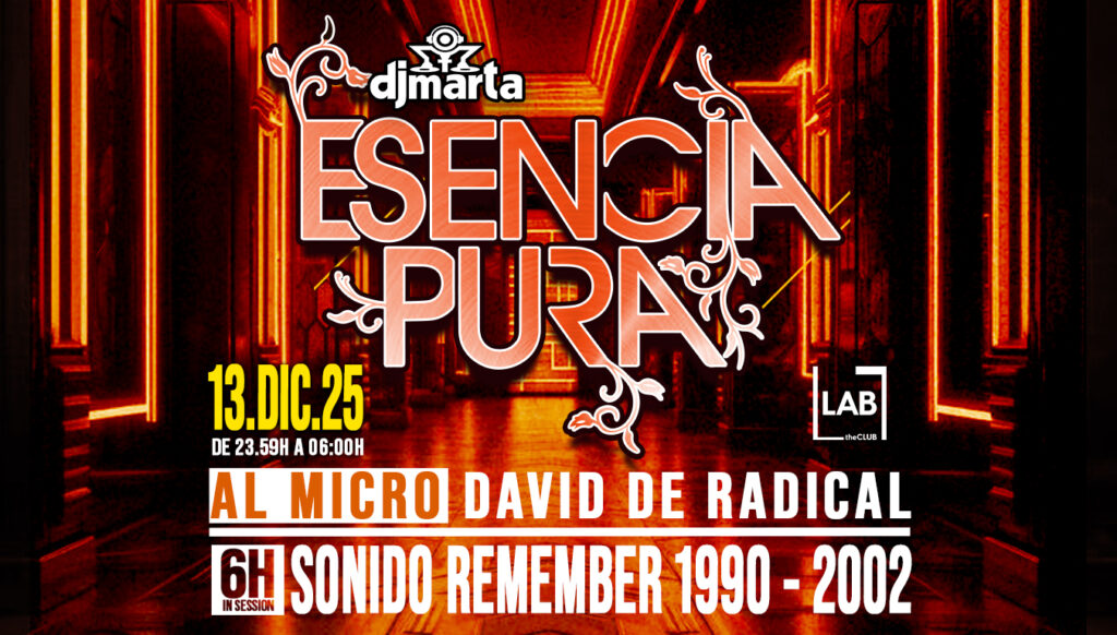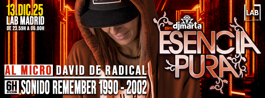 Una cita imprescindible para disfrutar de DJ Marta en su máxima expresión. 6H IN SESSION de sonido remember 1990–2002, con una selección de himnos y clásicos mezclados con la energía y técnica que la han convertido en referente absoluto. Desde las 23:59 hasta las 06:00, la pista será un viaje continuo de emociones, con David de Radical al micro para elevar cada momento. Si amas el espíritu ((Radical)) y quieres vivir a Marta de cerca, esta es la noche